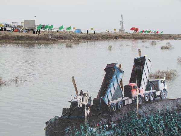 ماکت کمپرسی های جهاد هم در حال خاکریزی در آب و ساختن جاده شهید همت هستند.