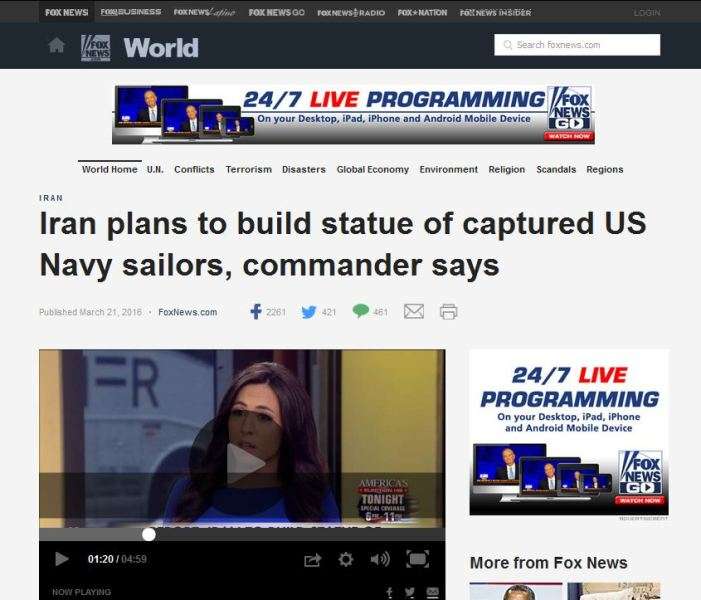 شبکه آمریکایی فاکس نیوز (Fox News) در گزارشی به انعکاس این خبر پرداخته و از تحقیر آمریکا توسط ایران سخن به میان آورده و عنوان می کند: «سپاه پاسدران ایران قصد دارد مجسمه ای از 10 ملوان آمریکایی دستگیر شده به عنوان یک جاذبه گردشگری بسازد... مجسمه ای که یادآور تحقیر آمریکا و نیروی دریایی ما است؛ موضوعی که جان کری به خاطر آن از ایران تشکر هم کرد».